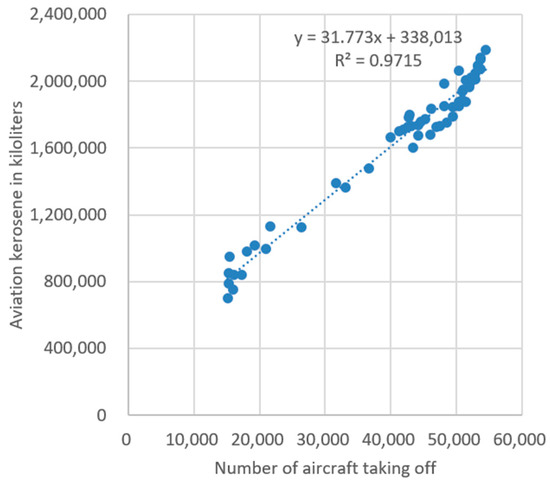 Figure 2 illustrates the relationship between the number of aircraft departures and the consumption of aviation kerosene measured in kiloliters. The data indicates a strong, positive, and statistically significant correlation between these two variables (r = 0.987, p < 0.001). The slope of the trend line suggests that for every thousand aircraft that take off, the consumption of aviation kerosene is expected to rise by 31.77 million liters (MLs).