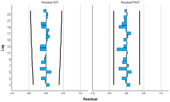 Data on aviation kerosene consumption from the first quarter of 2011 to the fourth quarter of 2018 were input into an IBM SPSS 29.0 data file. The forecasting module selected was expert modeling utilizing ARIMA models, which determined that the appropriate model for the dataset was a seasonal ARIMA(1,1,0)(0,1,1)4. The MAE value was 33,137, the MAPE value stood at 1.814, and the RMSE value was 49,107. The R-squared value was found to be 0.910, with a normalized BIC of 21.844. When this model was evaluated against alternative models, as presented in Table 1, the seasonal ARIMA(1,1,0)(0,1,1)4 model demonstrated the best fit based on MAE, MAPE, RMSE, R2, and BIC values. Furthermore, the residual autocorrelation function (ACF) and partial autocorrelation function (PACF) plots exhibited no significant spikes, further validating the suitability of the identified seasonal ARIMA model, as illustrated in Figure 3.