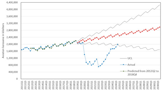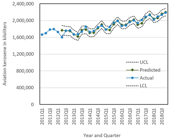 Aviation kerosene consumption for 2011Q1 to 2018Q4 (actual, predicted, UCL and LCL).