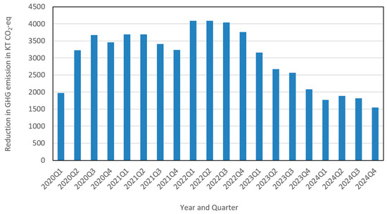 The net calorific value for aviation kerosene is 0.0358 TJ/kL, while the default emission factors established by the IPCC for aviation kerosene are 71,500 kg/TJ for CO2, 0.5 kg/TJ for CH4, and 2 kg/TJ for N2O. Consequently, 1000 ML of aviation kerosene yields a heating value of 35,798 TJ, resulting in an emission of 2559.5 kilotons (kT) CO2, 17.9 tons of CH4, and 71.6 tons of N2O. Utilizing the GWP values of 1, 29.8, and 273 for CO2, CH4, and N2O, respectively, the total emissions from 1000 ML of aviation kerosene amount to 2579.6 KT of CO2-eq. Figure 7 illustrates the estimated GHG reduction from the first quarter of 2020 through the fourth quarter of 2024, which covers the impact of the COVID-19 pandemic. The GHG reduction was estimated at 1971 kT of CO2-eq in the first quarter of 2020, peaked at 4088 kT of CO2-eq in the second quarter of 2022, and subsequently decreased to 1549 kT of CO2-eq by the fourth quarter of 2024. Annually, the GHG reductions were estimated to be 12,330 kT of CO2-eq in 2020, followed by 14,025 kT in 2021, 15,973 kT in 2022, 10,475 kT in 2023, and 7020 kT in 2024.