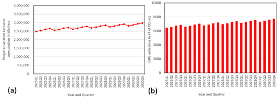 (a) Projected aviation kerosene consumption; (b) the corresponding GHG emissions from 2025Q1 to 2030Q4.