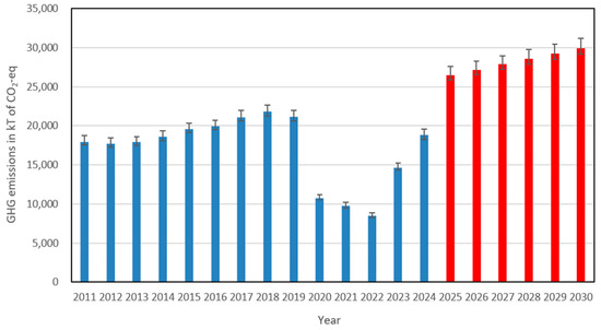 The IPCC (2006) suggested that the 95 percent confidence intervals for CO2 emission for aviation kerosene was between 69,800 and 74,400 kg/TJ [13]. Additionally, the 95 percent confidence intervals for CH4 and N2O emissions from aviation kerosene were reported as 0.215 to 1 kg/TJ for CH4 and 0.6 to 5 kg/TJ for N2O. The emissions of CO2, CH4, and N2O are characterized by lognormal distributions [13]. To assess the confidence intervals of GHG emissions, Monte Carlo simulations were executed 1000 times, addressing the uncertainties related to CO2, CH4, and N2O emissions resulting from aviation kerosene consumption in a probabilistic framework. The findings revealed that total GHG emissions in 2018 amounted to 21,786 kT of CO2-eq, with a 95 percent confidence interval ranging from 21,203 to 22,685 kT. This figure decreased to 8482 kT of CO2-eq by 2022, with a 95 percent confidence interval of [8268, 8828] kT. Furthermore, it is anticipated that total GHG emissions will reach 29,899 of CO2-eq by 2030, with a 95 percent confidence interval of [29,156, 31,187] kT. Figure 9 illustrates both the actual and predicted GHG emissions, along with their respective 95 percent confidence intervals.