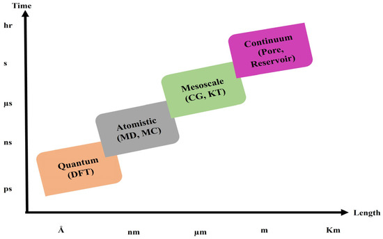Understanding the work scale is necessary before beginning any laboratory, simulation, or theoretical work. As the name implies, molecular simulation is conducted in dimensions ranging from nanometers to micrometers at the molecular scale (Figure 1). Since these simulations are expensive, very powerful computers will eventually be required. Coarse-grain simulations can be used to lower these expenses. The accuracy of the work decreases when it treats a particular set of molecules as a larger molecule. However, there will also be a reduction in cost and simulation time. Additionally, angstrom-scale quantum and DFT simulations can be used to determine the charge of an atom and verify the characteristics of an electron and its quantum properties [7,8,9,10].