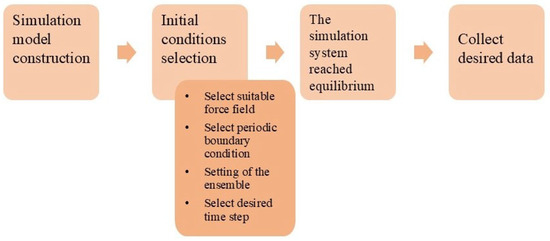 Figure 2 demonstrates the diagram that depicts a step-by-step process for constructing a model for molecular simulation. The first step is to set up the initial conditions, which include specifying the number and type of molecules in the system, as well as their initial positions and velocities. The second step is to select a force field, which is a set of equations that describes the interactions between the molecules. The third step is to select the periodic boundary condition, which specifies how the simulation cell will be replicated to create an infinite system. The fourth step is to select the time step, which is the amount of time that will elapse between each step of the simulation. After the model has been constructed, the system can be equilibrated, which involves simulating for a long time to allow the system to reach equilibrium. Finally, data can be collected from the simulation, which can be used to calculate a variety of properties of the system [8,9,10].