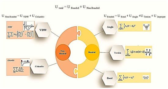By utilizing numerical integration to solve the applicable Newton’s equation of motion for any atom in a molecular structure, the MD simulation approach calculates the atomic motion of molecules. Macroscopic features of the system are obtained by monitoring the trajectories and velocities of particles as a function of their interactions across time, and by utilizing statistics. The atoms and molecules assigned interaction potentials are determined by the appropriate FF model [12]. According to Figure 3, the FF model can be easily characterized as an arrangement of springs and rubber balls that represent atoms and their bonds, respectively [13]. The intramolecular and intermolecular interactions of this representation are highlighted by bonded and non-bonded energies. Bonded potential energies include interactions among the linked atoms via springs (bond forces), with hinges (valence angle potentials), and four-body interactions of proper and improper dihedral interactions. Coupled with the coulombic interaction and the Lennard–Jones (LJ) potential term, the interactions of intermolecular forces include coupled short-range repulsive Pauli exclusion forces and attractive van der Waals (vdW) forces [8,10,12].