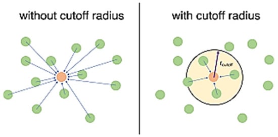 The cutoff radius in a molecular dynamics (MD) simulation is a distance used to approximate how far interactions between atoms are important. It essentially creates a spherical boundary around each atom (Figure 4). Interactions between atoms within this radius are calculated explicitly, while those beyond are neglected [12]. Using a larger cutoff radius makes the simulation more accurate by accounting for more interactions, but it also increases the computational cost. A typical cutoff radius is around 2.5 times the sigma (σ) value, which represents the distance at which the repulsive and attractive forces between atoms cancel out in the Lennard–Jones potential. Another rule of thumb is to keep it less than half the size of the simulation box [7,8,9,10].