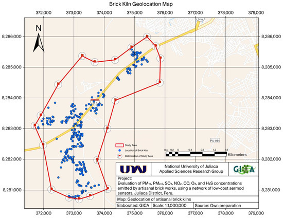 Locations of Scottish-style artisanal brick kilns in Juliaca City, developed using georeferencing techniques with Global Positioning Systems (GPSs) and Unmanned Aerial Vehicles (UAVs).