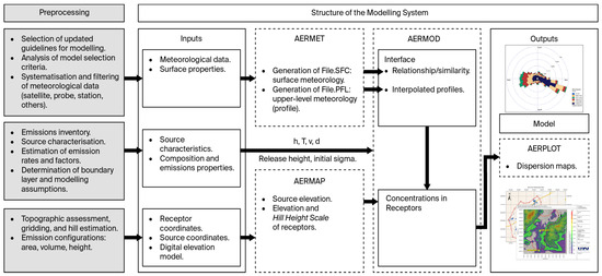 Dispersion modelling of atmospheric pollutants was carried out under the guidelines established in the “AERMOD Implementation Guide” provided by the Office of Air Quality Planning and Standards and the Air Quality Assessment Division, Research Triangle Park, under the EPA [41]. The procedure is illustrated in Figure 2.