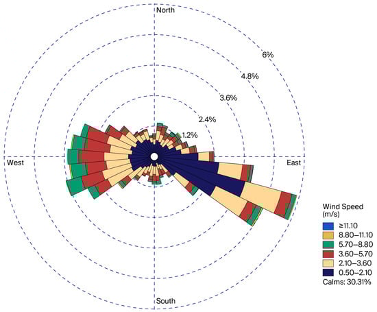 Cloud cover data were obtained from the CLIMATE COPERNICUS–ERA-5 platform of the European Centre for Medium-Range Weather Forecasts (ECMWF) [40], which provided relevant information for the determination of the boundary layer and application of the model. The prevailing winds were from the southwest and northwest (SW-NW), moving in a southeast (SE) direction, with velocities between 1.10 and 11.10 m/s and an annual frequency of appearance greater than 5.8%. This information is provided in the wind rose diagram and distribution. Furthermore, a maximum of 32.4% of winds had velocities of 0.50–2.10 m/s, while 19.6% had velocities of 2.10–3.60 m/s, 11.6% had velocities of 3.60–5.70 m/s, 5.1% had velocities of 5.70–8.80 m/s, 0.5% had velocities of 8.80–11.10 m/s, and 0.1% had a velocity greater than 11.10 m/s. However, 30.3% of winds were calm.