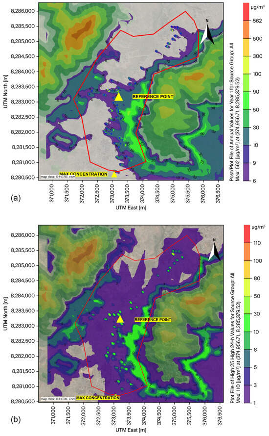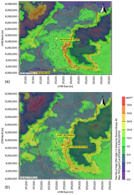 PM10 is dispersed over a distance of 2.64 km from the reference point at UTM coordinates 373,201.00 m east and 8,283,273.00 m south, predominantly towards the southeast. An average distribution of 83.6 m from the emission source was observed. In addition, a maximum concentration of PM10 was identified in the southeast corner of the study area, reaching a value of 562 µg/m3 according to the AERMOD dispersion model [24]. The measurement corresponds to UTM coordinates 373,056.71 m east and 8,280,729.52 m south (Figure 4a).