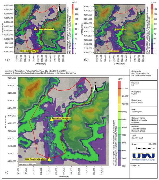 Dispersion maps of SO2 (a), NOx (b), and CO (c) emitted by artisanal brick kilns in the study area under typical meteorological conditions during the 2024 dry season. Higher concentrations are observed in proximity to the emission sources.