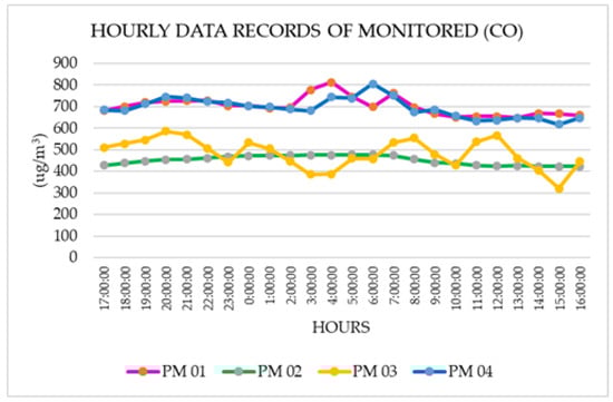 For carbon monoxide (CO), the maximum concentration was 813.34 μg/m3, which resulted in a high average concentration of 687.10 μg/m3 at the PM 01 monitoring point; similarly, PM 04 recorded 806.67 μg/m3, unlike PM 02 and PM 03, which recorded values data lower than 476.89 μg/m3 and 586.901 μg/m3, calculated over 8 h.