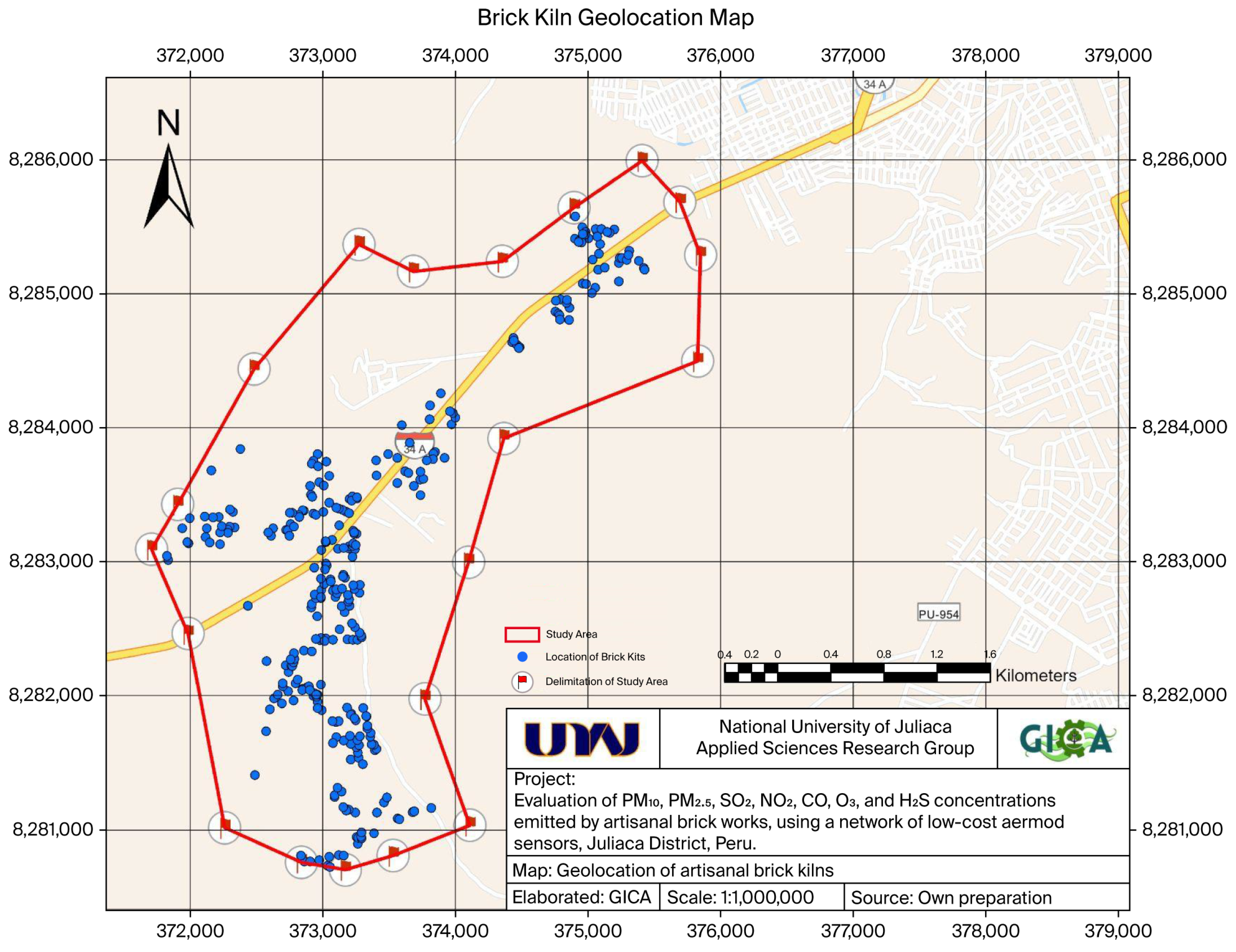 The survey results show that in the study area called “Salida Arequipa”, there are approximately 312 artisanal brick kilns, both operational and non-operational, which are distributed over an area containing 10,558.78 m2 with a perimeter of 15,703 m2, with a seasonality corresponding to the year 2024.