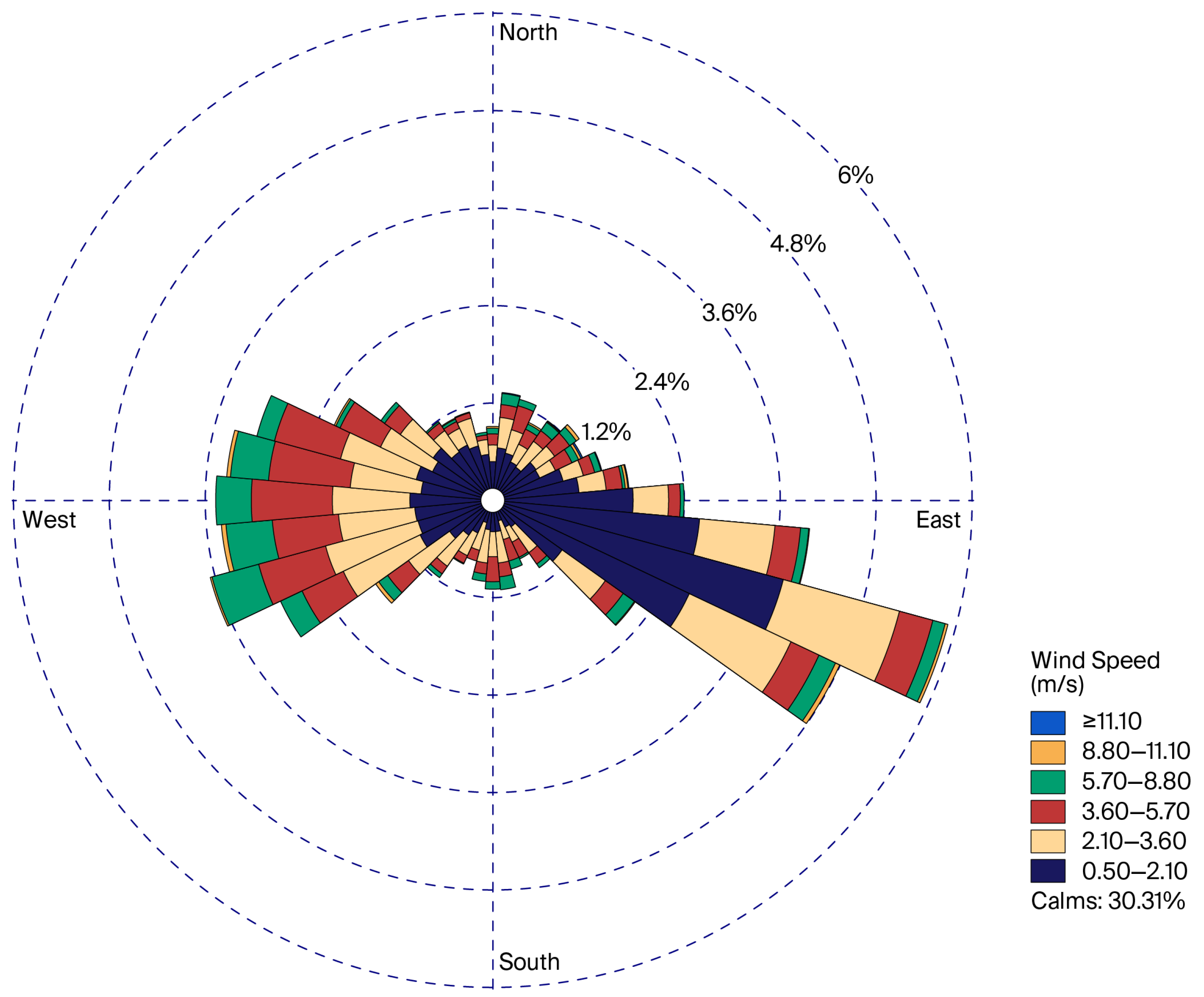 Regarding wind velocity, 32.4% of winds were found to occur at velocities between 0.50 and 2.10 m/s, followed by 19.6% in the range of 2.10 to 3.60 m/s, 11.6% between 3.60 and 5.70 m/s, 5.1% between 5.70 and 8.80 m/s, 0.5% between 8.80 and 11.10 m/s, and 0.1% with a velocity greater than 11.10 m/s [