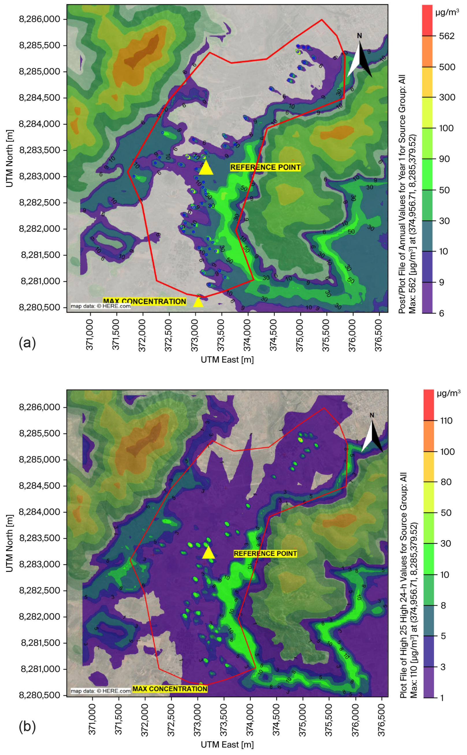 2 was identified at the southeastern edge of the study area, at coordinates 373,056.32 m east and 8,280,729.89 m south. AERMOD revealed a maximum SO