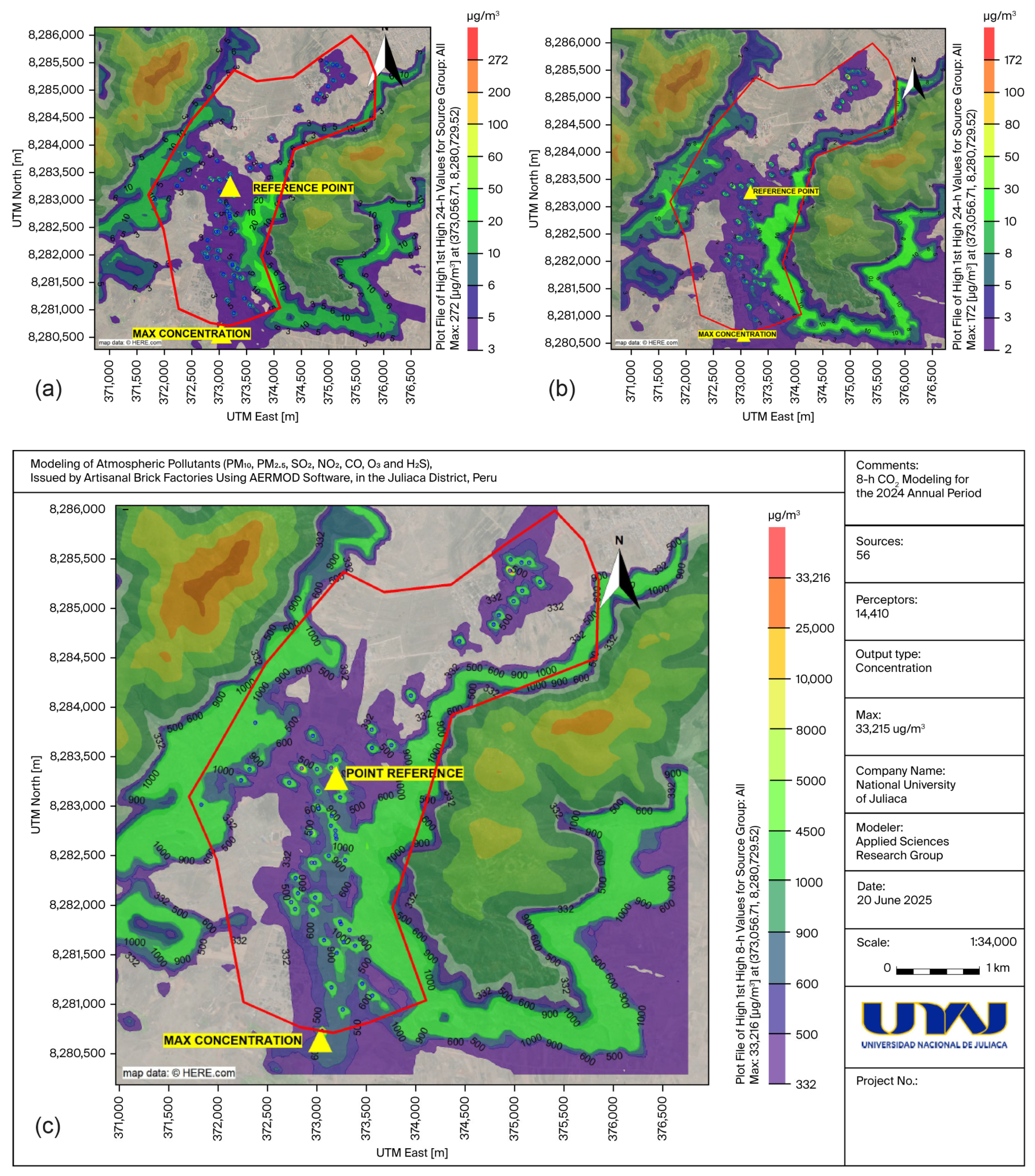 Analysing the atmospheric pollutants emitted by artisanal brick kilns in Juliaca City—including ozone (O3), hydrogen sulphide (H2S), particulate matter (PM10 and PM2.5), sulphur dioxide (SO2), nitrogen dioxide (NO2), and carbon monoxide (CO)—allowed us to model the spatial dispersion of these compounds within the Juliaca airshed. This approach is essential to understanding the dynamic behaviour of the toxic agents emitted by the point sources and to identifying locations with the highest levels of exposure to harmful substances within the urban area under study. This assessment helped to more accurately quantify the specific contribution of point sources (artisanal kilns) to the deterioration of air quality at the local level. The results were compared with data collected using low-cost sensors, which strengthened the reliability of the estimates and the calculation of contributions, enabling a more rigorous and efficient assessment of the real impact of emissions from the brick-making sector on urban air quality.