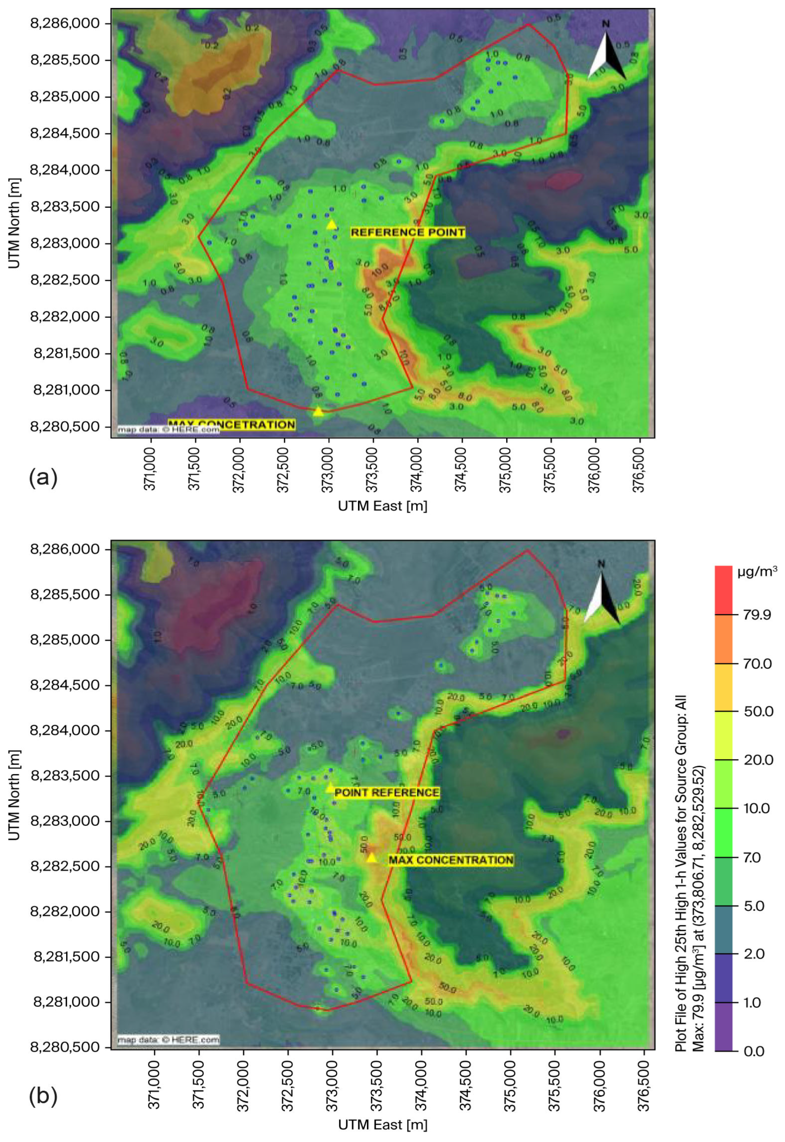 2 was recorded at the southeastern edge of the research area, at coordinates 373,056.71 m east and 8,280,729.52 m south. Modelling results from AERMOD estimated the maximum NO