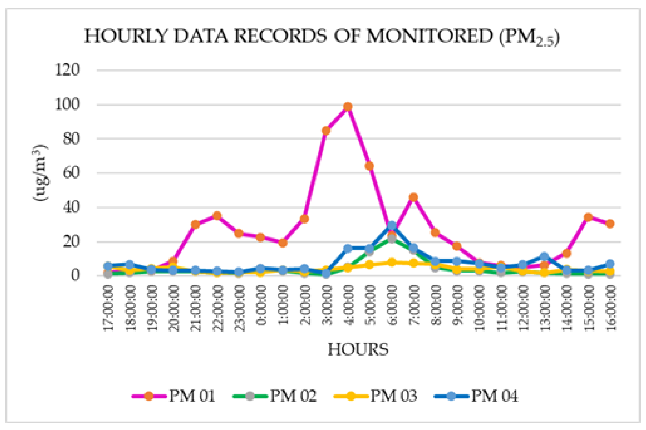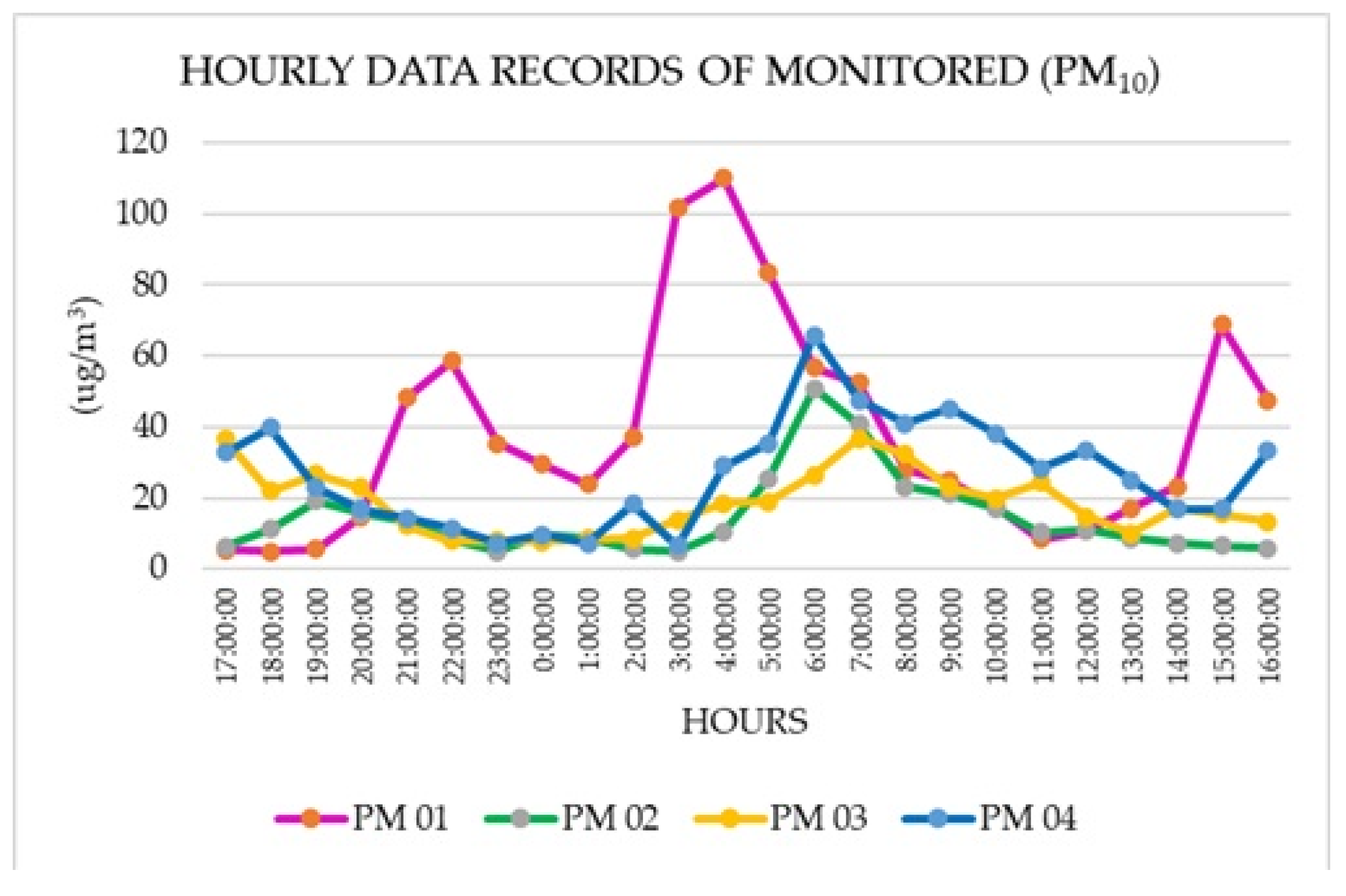Low-cost sensors (LCSs) recorded data with a 5-min time resolution, which were subsequently processed and averaged over hourly intervals for analysis. Regarding particulate matter with a diameter of less than 10 micrometres (PM10), a maximum concentration of 109,928 μg/m3 was recorded at the PM 01 monitoring station, which is the closest to the brick kiln area. The highest values were measured between 3:00 and 7:00 in the morning.