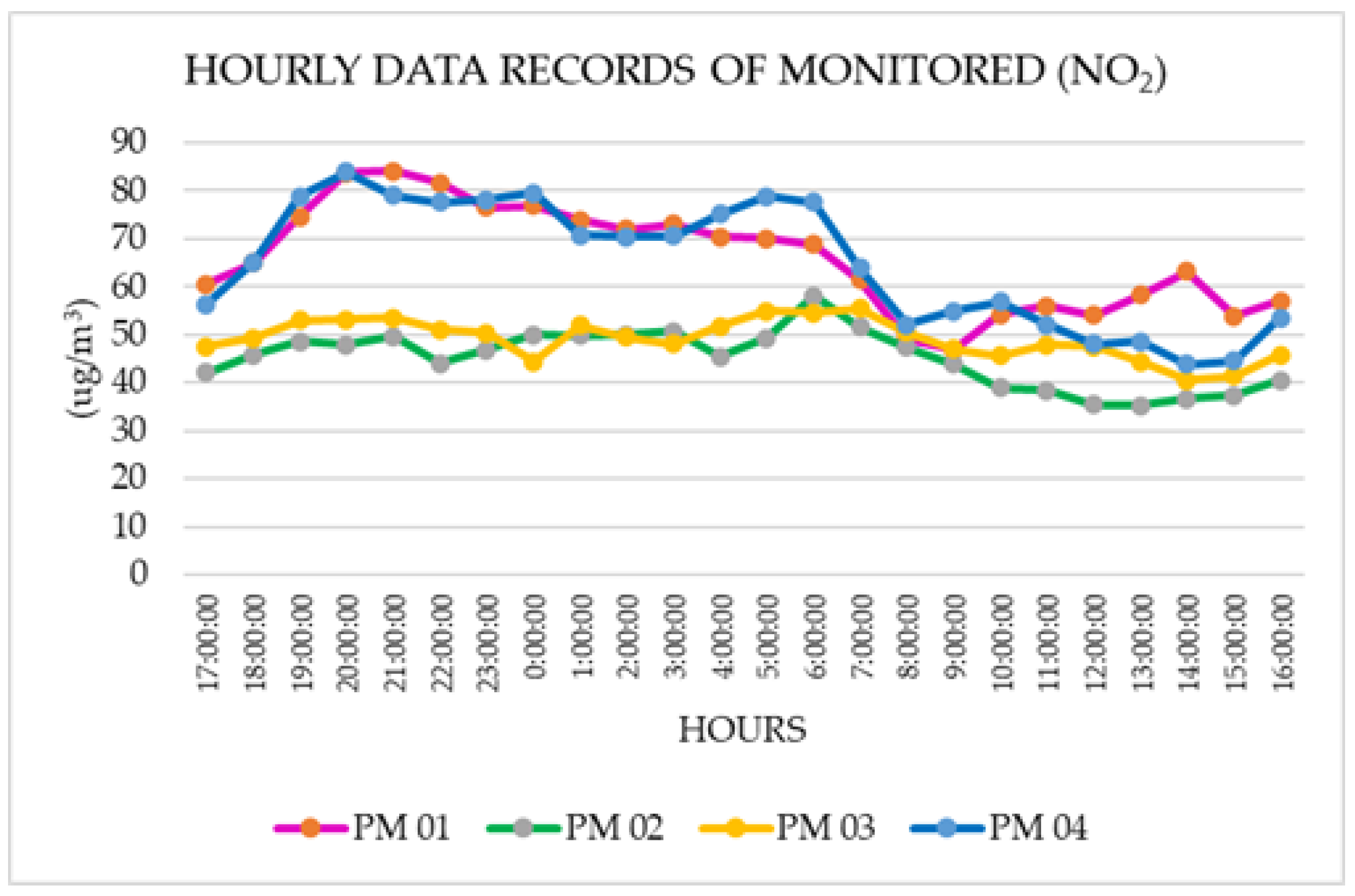 Concerning nitrogen dioxide (NO2), the maximum hourly concentration reported was 84.13 μg/m3 at PM 01. However, the maximum value monitored was 83.97 μg/m3 at PM 04, while the concentrations lower than 58.19 μg/m3 were detected at PM 02 and PM 03.