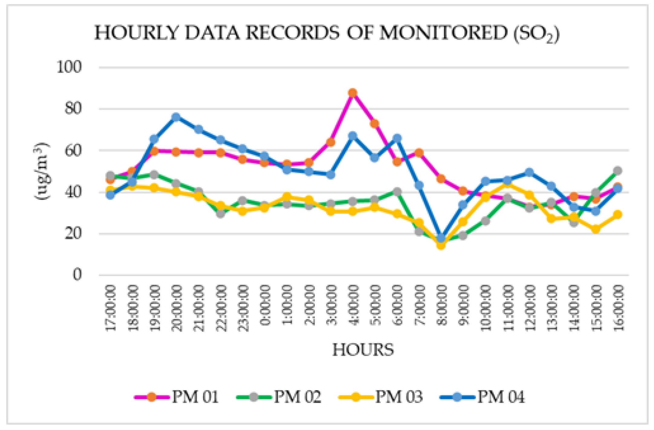 Dioxide was recorded at the highest levels at stations PM 01 and PM 04, which are the closest to the monitoring area. The measured levels were 87.8 μg/m3 and 76.36 μg/m3. In contrast, PM 02 and PM 03 presented lower levels at 50.34 and 44.18, respectively.