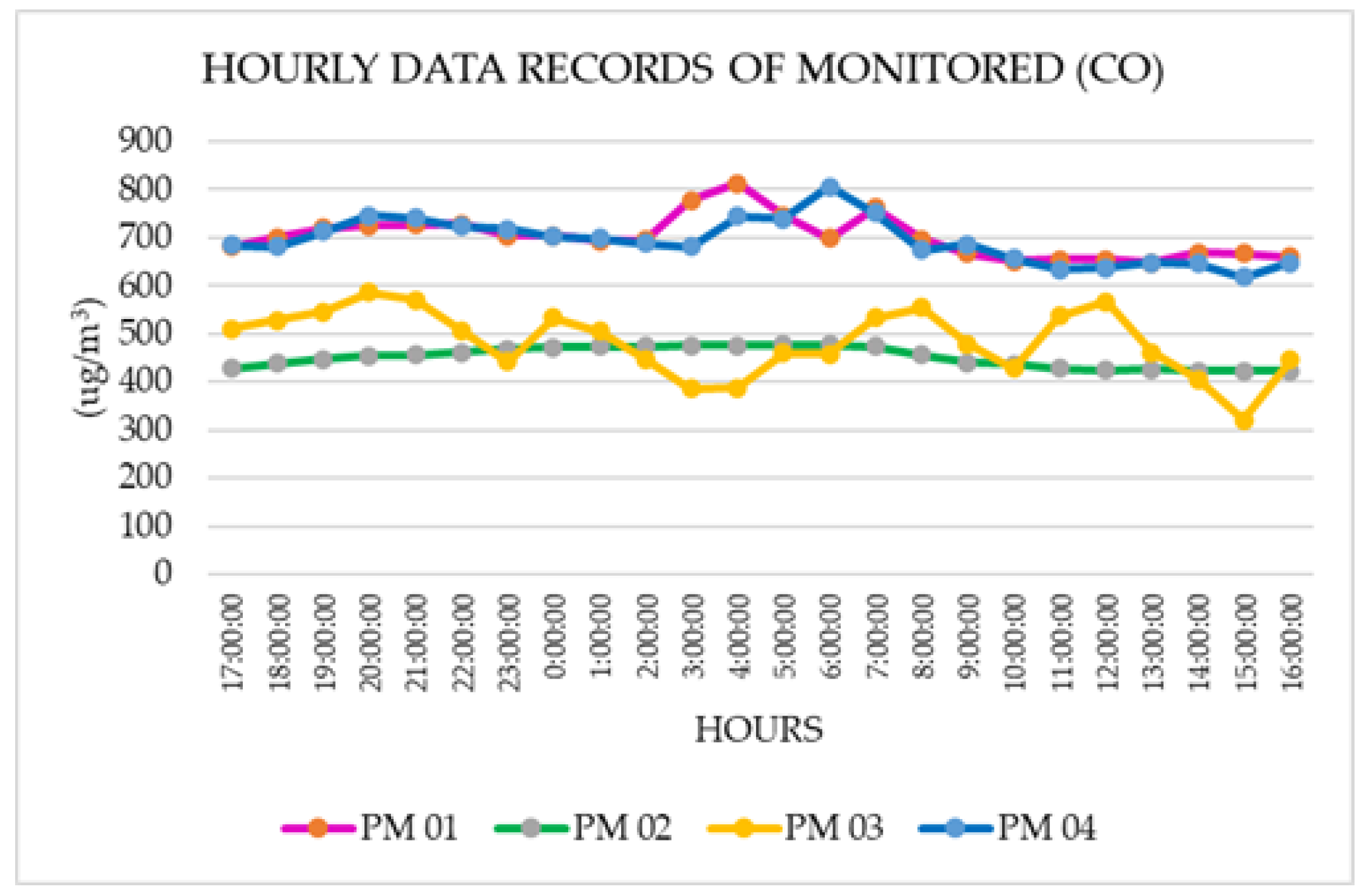 For carbon monoxide (CO), the maximum concentration was 813.34 μg/m3, which resulted in a high average concentration of 687.10 μg/m3 at the PM 01 monitoring point; similarly, PM 04 recorded 806.67 μg/m3, unlike PM 02 and PM 03, which recorded values data lower than 476.89 μg/m3 and 586.901 μg/m3, calculated over 8 h.