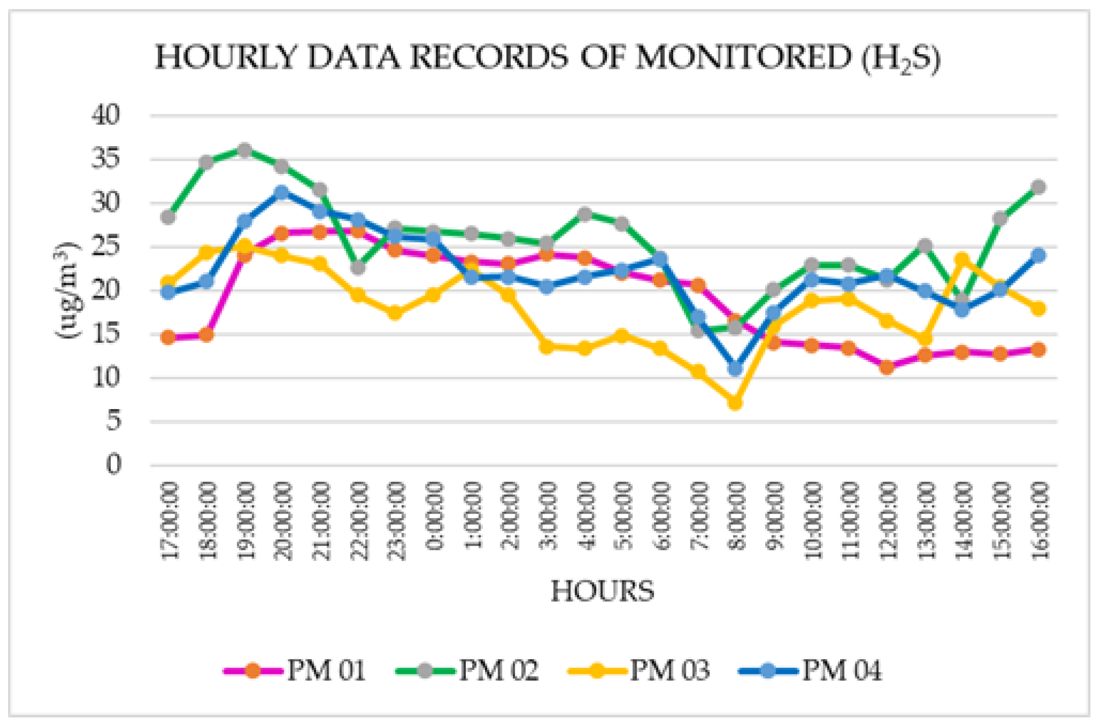 For hydrogen sulphide (H2S), the highest value was recorded at PM 02 at 36.14 μg/m3, followed by 31.29 μg/m3 at PM 04.