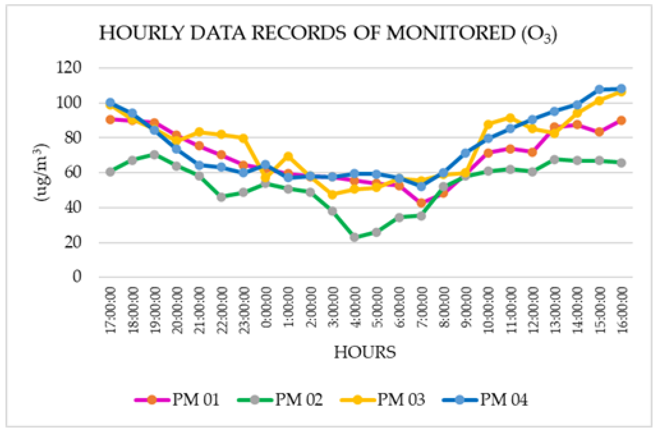 Finally, the pollutant ozone (O3) presented a maximum estimated concentration of 108.18 μg/m3 at PM 04. Comparable results were found at PM 01 and PM 03, where values of 93.72 μg/m3 and 106.44 μg/m3 were recorded, respectively.