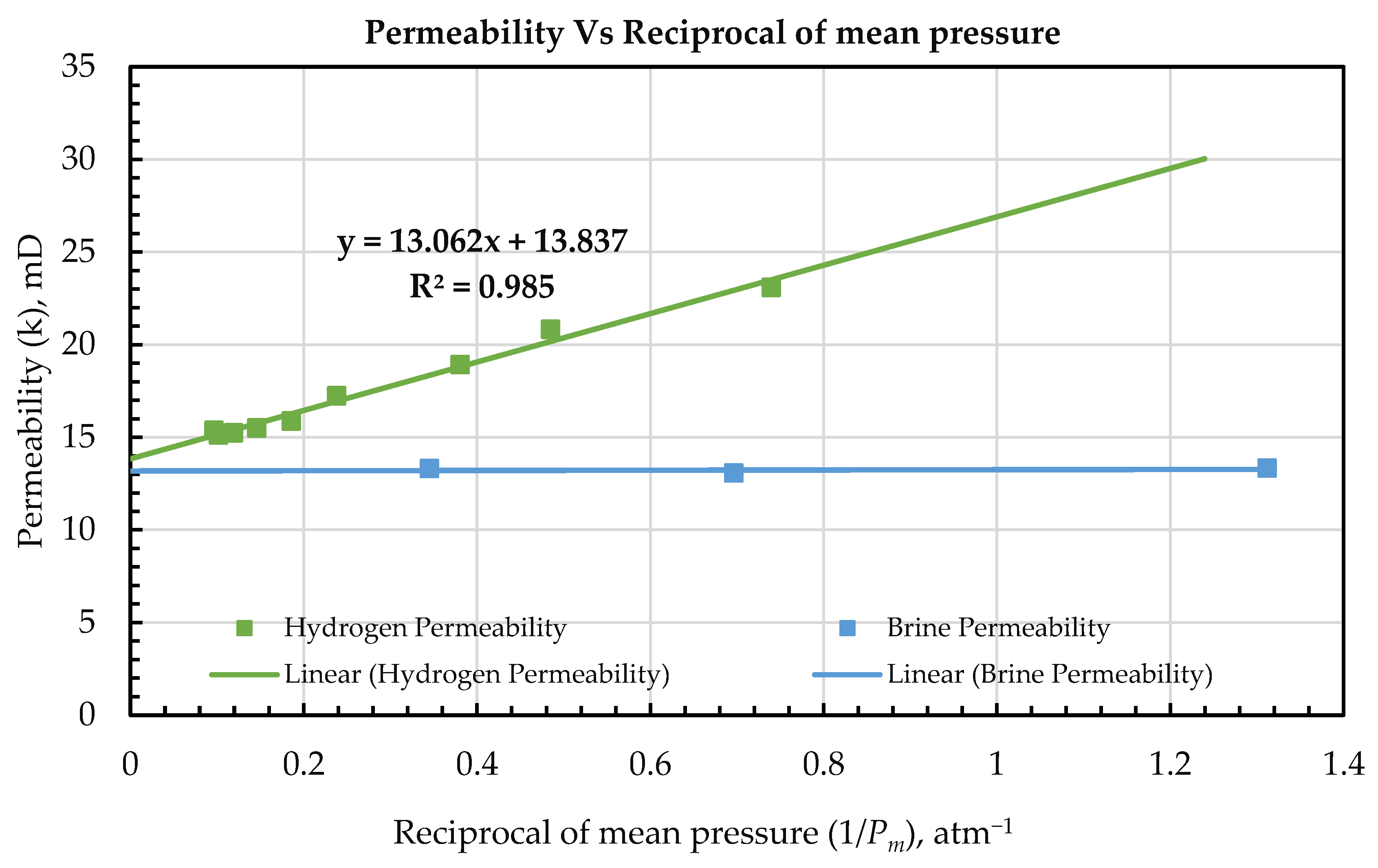 62]. The close correspondence between the brine and slip-corrected gas permeability values demonstrates the validity of the Klinkenberg correction and supports the conclusion that the core’s permeability is an intrinsic property, independent of the fluid phase when slip effects are properly addressed.