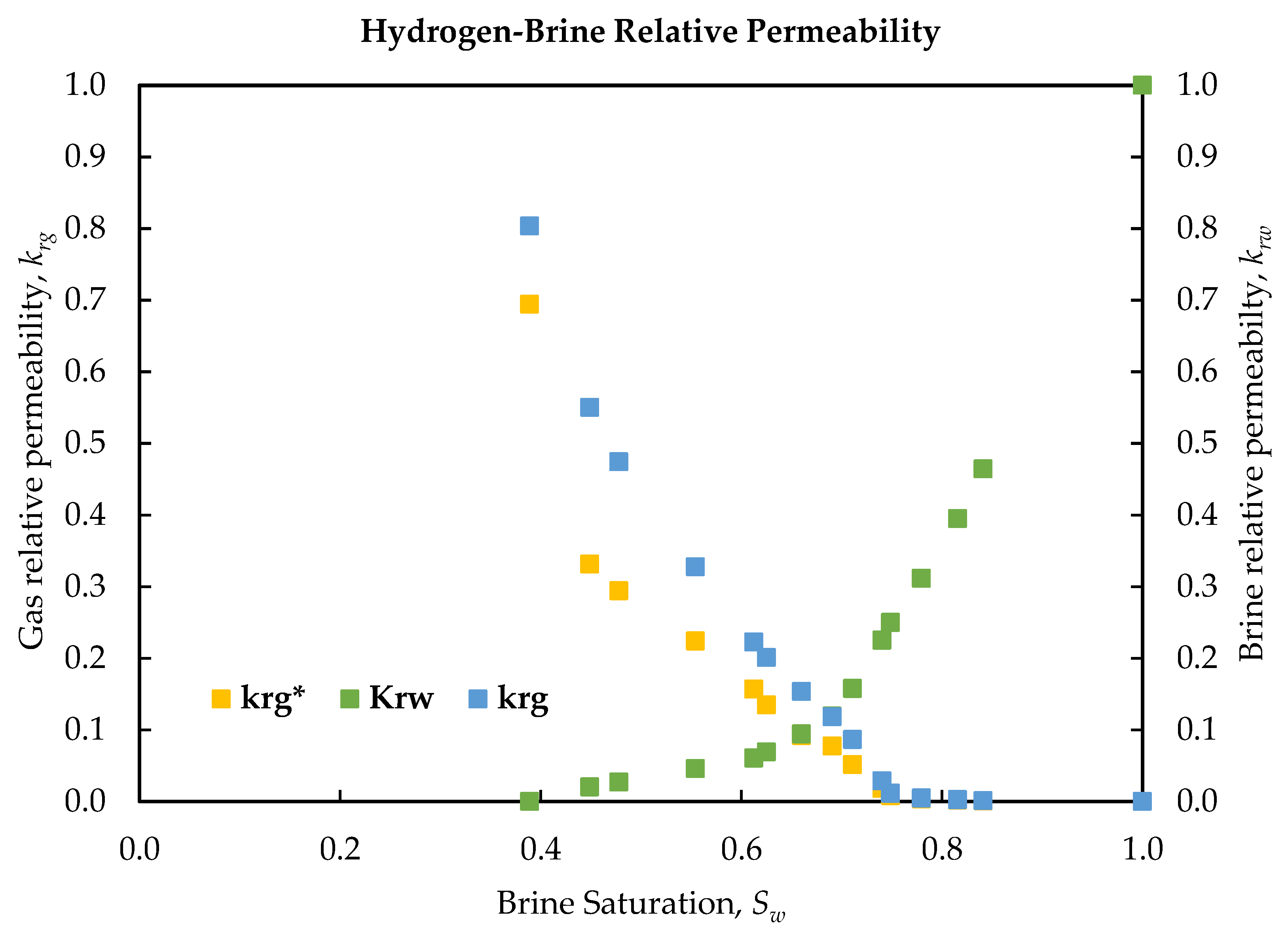2 or methane–water’s relative permeabilities maxing out around 0.5–0.6 under similar saturations. Our hydrogen results reach a somewhat higher gas conductivity, which can be attributed to hydrogen’s lower interfacial tension and viscosity. Overall, the shape of the hydrogen relative permeability curve mirrors those documented for methane–brine or air–brine systems in strongly water-wet rocks [