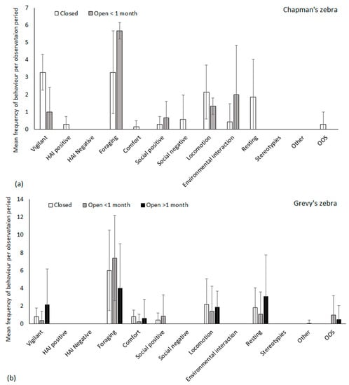| Grevy’s zebra | Vigilant Feeding Comfort Social positive Locomotion Resting OOS | HAI positive, HAI negative, negative social interactions, ARBs and environmental interactions (n = 0 observations) |