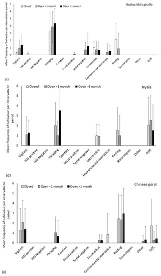 | Chinese goral | Vigilant Feeding Locomotion Environmental interactions Resting OOS | Lone housed so social interactions (positive/negative) not applicable. Comfort, ARBs, HAI positive and HAI negative (n = 0 observations) |