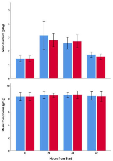 UVB treatment had no significant effect on calcium levels (F1,75 = 0.299, p = 0.6), but there was a significant effect of time (F1,75 = 13.8, p < 0.001). Calcium was significantly higher at 24 h and 48 h than at 0 h (p < 0.001; p < 0.001, respectively) and at 72 h (p < 0.001; p < 0.001, respectively), but there was no difference between 24 and 48 h (p = 0.21) or between 0 and 72 h (p = 0.48). Mean (SD) calcium content was 1.429 (0.353), 2.962 (1.248), 2.639 (0.702), and 1.650 (0.314) g/Kg at 0, 24, 48, and 72 h, respectively (Figure 1, top). Neither time nor UVB treatment had significant effects on phosphorus (F1,75 = 0.365, p = 0.8; F1,75 = 0.019, p = 0.9, respectively; Figure 1, bottom). Mean (SD) phosphorus content of samples was 8.480 (0.871) g/kg.