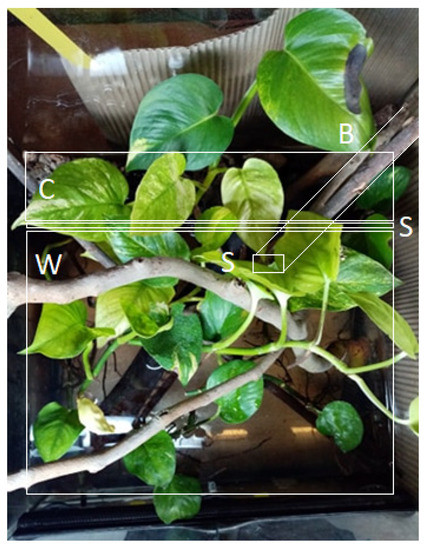 The view from above a typical 45 cm3 Exo Terra vivarium setup, furnished with appropriately sized branches for the animal’s size, including live devil’s ivy (Epipremnum aureum), and a cork land area (C) with a water body (W) with a depth to the cork land area. Shorelines (S) were recorded where the water body met the cork land area and submerged branches. The branch resource areas (B) were recorded as any above water branch area. Resource areas for the cork and branches were further divided into bask and non-bask resources. More exposed resources in this study were noted as the branches within and outside of the bask zone, the shoreline, and the water body. The cork within and outside of the bask zones were noted as being less exposed, as they were more sheltered from overlying branches and vegetation. Labelled resource areas in this figure are representative and not to scale. Corrugated cardboard outside each vivarium restricted between-vivaria visibility of lizards occupying neighbouring vivaria.