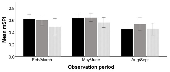 The mSPI was significantly affected by observation period (F2,28 = 3.895, p = 0.045) but not by time period (F2,28 = 3.102, p = 0.077) or the interaction between the two (F4,28 = 0.876, p = 0.491) (Figure 2).