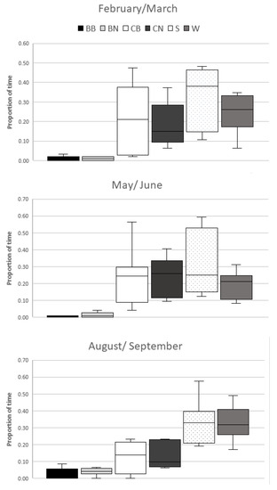 Proportion of time spent in each resource zone, comparing between observation periods; February–March, May–June, and August–September. BB = branches within the bask zone, BN = branches outside of the bask zone, CB = areas of the cork land within the bask zone, CN = cork land areas outside of the bask zone, S = shorelines, including the cork and branches where these meet the water body, W = water body.