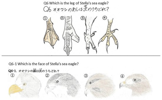 The questionnaire method was widely used to evaluate the educational effects of zoo animals [23,24]. To evaluate the degree of animal observation, we developed questions about the morphological features of the six animals that differed from the animals in the quiz game (e.g., Stella’s sea eagle, Figure 2). Morphological questions were the body patterns of spotted seal, ear shape of Japanese macaque, ear patterns of tiger, eye shape of sheep, ear shape of llama and face shape of Steller’s sea eagle. Careful observation was required to answer correctly. We asked these questions to visitors after they finished observing animals when the programs were not in place (control) and when the two programs were in place (experiment). In addition to the questions on animal characteristics, we asked two other questions: whether visitors observed animals after stopping and whether visitors noticed and read information boards.