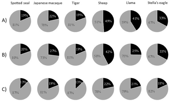 Percentage of visitors on different behavior in target species. (A) Control, (B) Stamp collecting, (C) Quiz game. Grey and black of pie chart show animal observation with stopping and without stopping, respectively.