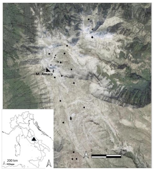 The study area included the highest sector of the Maiella National Park (about 24.5 km2 over 2300 m a.s.l.), which is one of the most important limestone mountain groups in the Central Apennines (Figure 1). The Park consists mainly of carbonate mountains, separated by valleys and karst high plateaus, with a broad altitudinal range (130–2793 m a.s.l.). The Maiella massif has more than 60 peaks, with half of them rising above 2000 m, and includes the second highest peak in the Apennines, i.e., Mount Amaro (2793 m a.s.l.). The mountain chain, which developed with a north-south alignment for about 30 km [,], is formed by peaks with gentle summit profiles and extensive summit areas, bordered by steep slopes and crossed by deep valleys of glacial origin [].