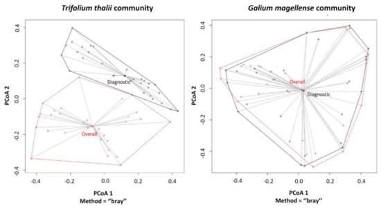 β-Diversity analysis for Trifolium thalii community and Galium magellense community performed on cover values for overall and diagnostic species. Principal coordinate plots report the two groups of sites within the minimum convex polygons, along with their multivariate centroids. Multivariate Levene’s test showed no significant differences between multivariate variances of the two groups of plots in both plant communities.
