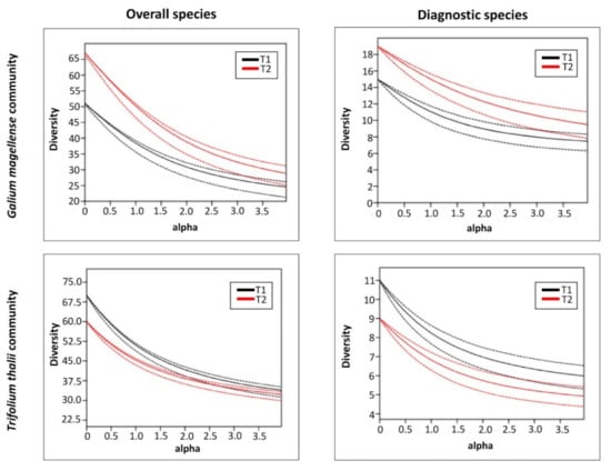 Renyi’s diversity profiles of the two studied plant communities, Trifolium thalii community and Galium magellense community, performed on cover values for overall species and for diagnostic species in two time steps (T1: 2001 and 2003, and T2: 2015 and 2020).