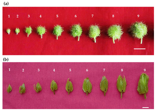 Morphological differences in developmental stages of the floral buds between (a) P. foetida (wild) and (b) P. edulis (cultivated) species considered for the ovule development study (scale bar = 1 cm).
