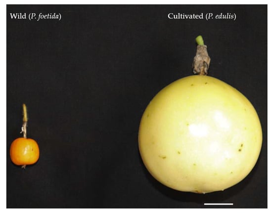 Differences in fruit morphology between P. foetida (wild) and P. edulis (cultivated; scale bar = 1 cm). The size and colour differences are notable between the wild and cultivated species of Passiflora.