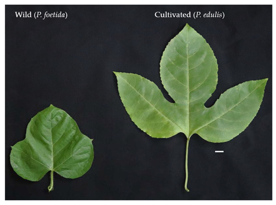 Leaf morphology in wild P. foetida and cultivated species P. edulis (scale bar = 1 cm). Note the differences in leaf size and the lobe incisions.