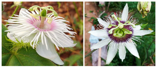 - Oliveira, I.S.d.S.; de Souza, V.C.; Santos, S.B.d.C.; Almeida, J.N.d.R.; Henrique, J.d.S.; Costa, P.M.d.A.; Silva, J.H.C.S.; Cassimiro, C.A.L.; de Lucena, C.É.A.; Melo, T.d.S. Floral biology and pollen viability of Passiflora edulis Sims. J. Exp. Agric. Int. 2019, 41, 1–9. [Google Scholar] [CrossRef][Green Version]
