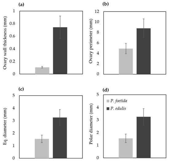 Micromorphological differences in the ovary of P. foetida (wild) and P. edulis (cultivated) species of Passiflora. (a) Ovary wall thickness, (b) perimeter, (c) Equatorial diameter and (d) Polar diameter. Data are mean ± SE (n = 6).