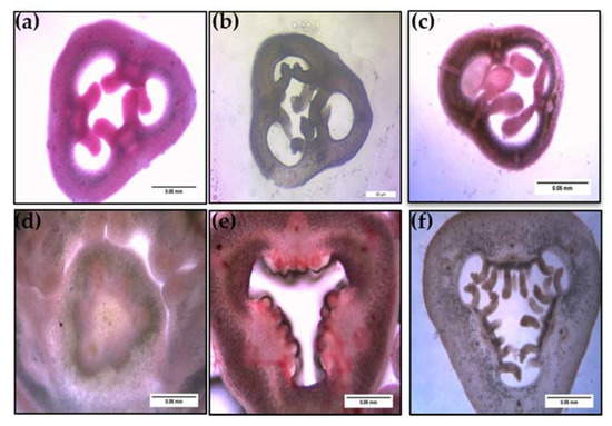 The ovule development begins with the primordial initial, which later develops to form the ovule [34]. The ovule, developed within the ovary, is protected by integuments and has a stalk called funiculus that attaches the ovule to the ovarian placenta [83,84]. When it attains maturity, the ovule curves inwards and becomes anatropous [34]. When the ovary matures, it becomes the fruit, and the ovules develop into seeds [85]. As observed by Padhye and Deshpande [86], the ovules were anatropic and bitegmic. The studies conducted by various researchers on the ovules of the different plants suggest that the ovule arises as a finger-like projection [87]. The initials of the integuments also arise from the top portion of these projections [34,86]. The results show that the finger-like projections soon develop into ovules covered by two integuments.