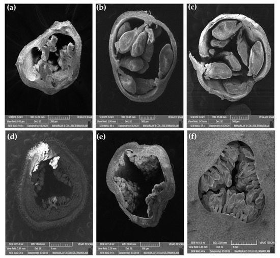 The pollen characters help to identify and distinguish between the different species and help explain the phylogenetic relationships [92]. The pollen of P. foetida and P. edulis had an oblate, spherical shape and were hexacolporate. The hexacolporate structure of the pollen of P. foetida was also observed earlier by Padhye and Deshpande [86]. Our study did not notice much difference in the pollens between the wild (P. foetida) and cultivated (P. edulis) at the morphological level. However, study of pollens is important for further studies focusing on phylogenetic aspects of the family Passifloraceae.