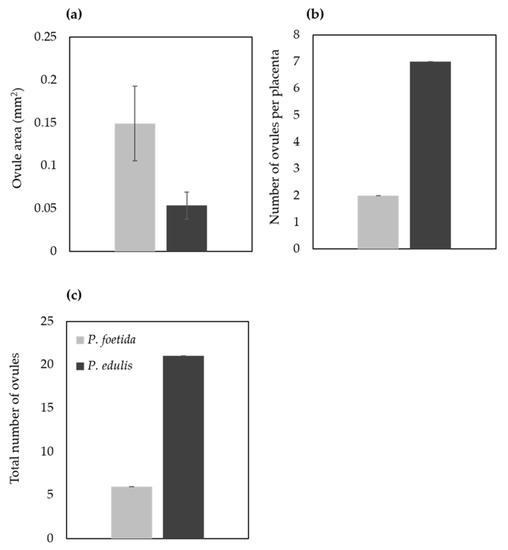 Ovule size was calculated as area in ImageJ (Figure 9), which led to the findings that mean ovule area in P. foetida (0.150 ± 0.04 mm2) was markedly greater than P. edulis (0.053 ± 0.016 mm2). On the other hand, cultivated P. edulis shows a higher number of ovules which vary from fruit to fruit are however smaller in size (Figure 7d–f and Figure 8d–f). Ovule count per placenta for P. foetida and P. edulis is two and seven respectively (Figure 9). The differences in sizes of the ovules may be because of faster development of ovules in the P. foetida in contrast to P. edulis which shows a very slow growth rate of its ovules. The larger ovule size of the wild species (P. foetida) is not reflected in its fruit size.