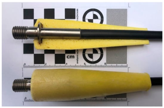 Sampling ends of some darts in this study (biopsy punch not shown). A cross-section was taken of a used dart (upper), the lower dart had not yet been used for sampling. Note apparent compression of the yellow foam in the upper (previously used) dart.