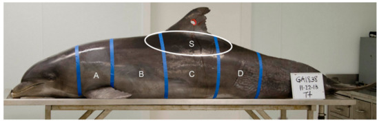 Grid partitions A, B, C, D, and S marked on an adult common bottlenose dolphin (GA1838) placed on a necropsy table. The hole in the dorsal fin was cut to use as a lifting point to hoist the dolphin onto the table with a crane.